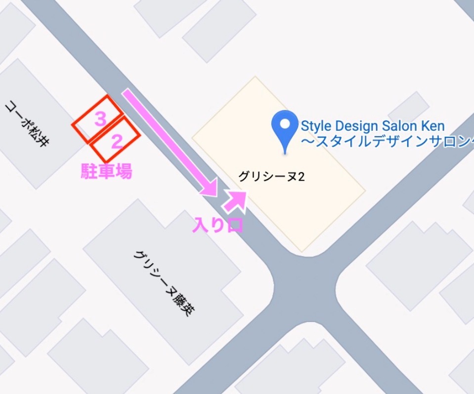 *駐車場はグリシーヌIIの斜め向かい側(南西)にあるコーポ松井というアパートの2番と3番になります。